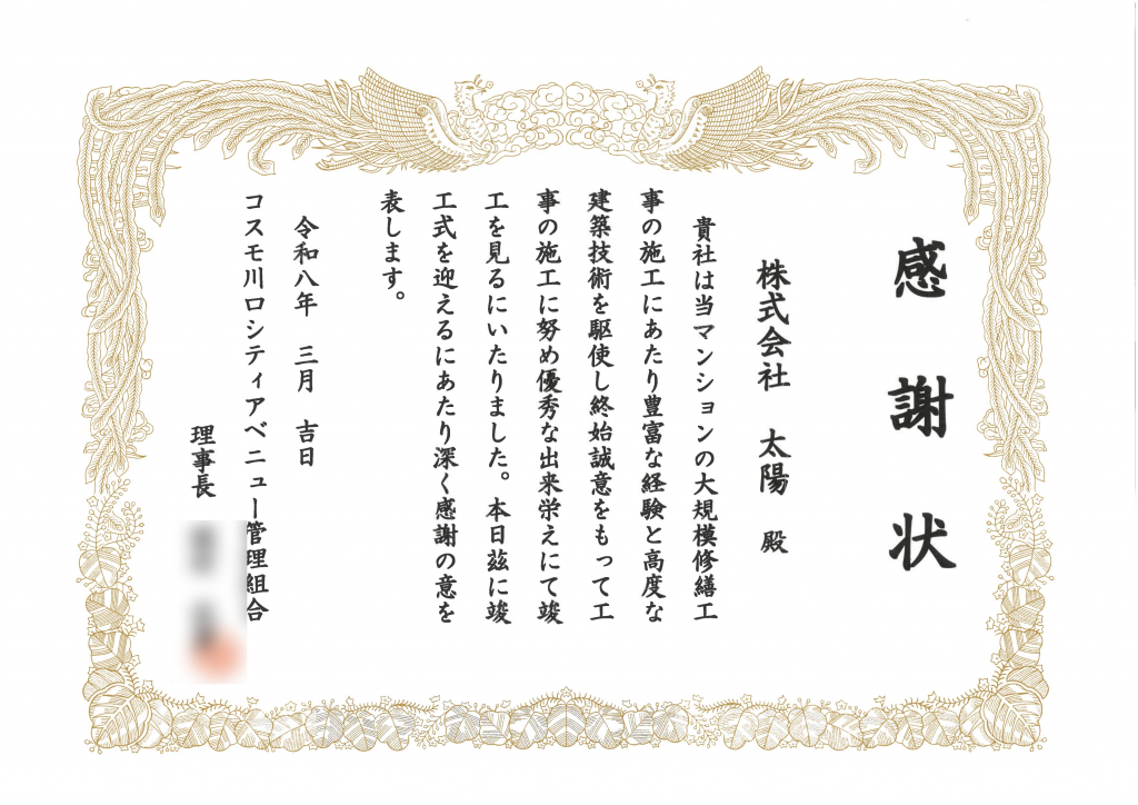 コスモ川口シティアベニュー管理組合様より、太陽が担当させていただいた大規模修繕工事の施工に対して感謝状をいただきました。
