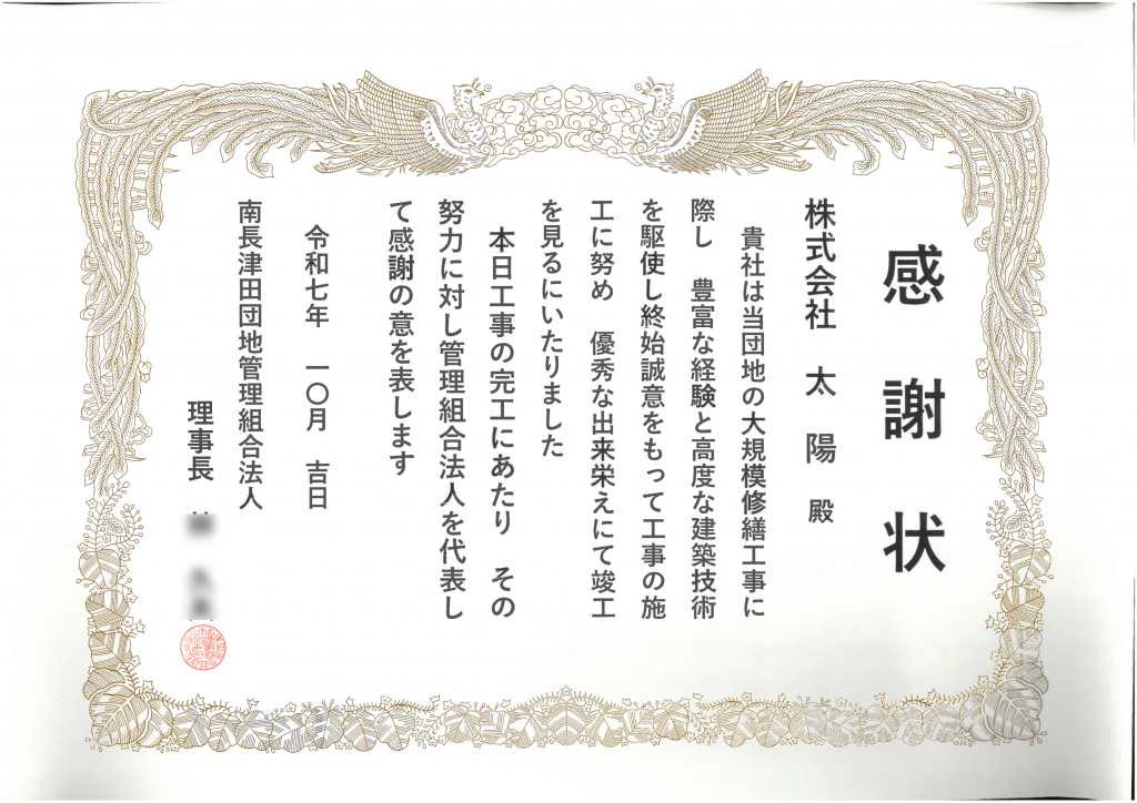 南長津田団地管理組合法人様より、太陽が担当させていただいた大規模修繕工事の施工に対して感謝状をいただきました。