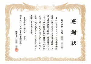 NEW!お知らせ2025.12.26ダイアパレス四谷舟町管理組合様より感謝状をいただきました