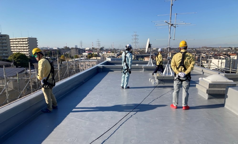 低層棟では現在、機械式固定(塩ビシート)防水工事がされておりました。