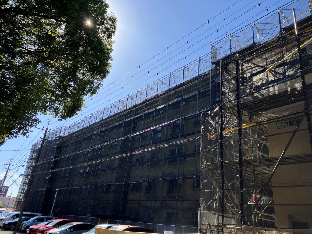 現場は5階建てで、現在は下地処理およびシーリング工事が概ね完了し、塗装工事が進行中です。