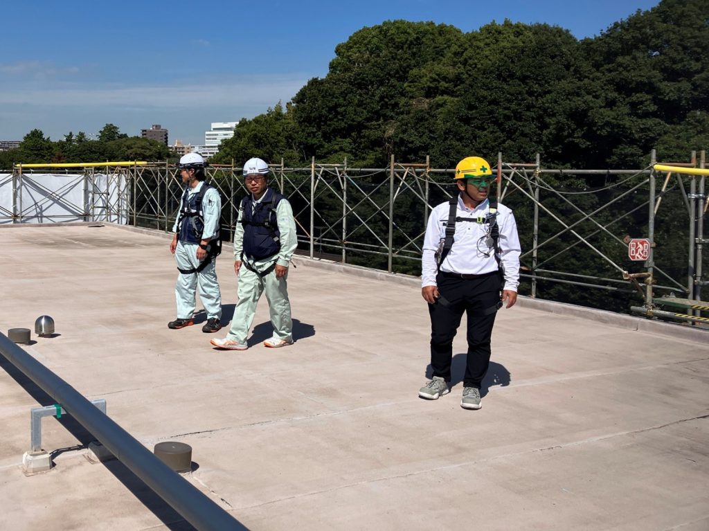 屋上を廻り足場内の点検へ。暑さが和らぎ、朝晩は肌寒さを感じるようになりましたが、作業をするには最適な気候となり、効率的に進めることができています。