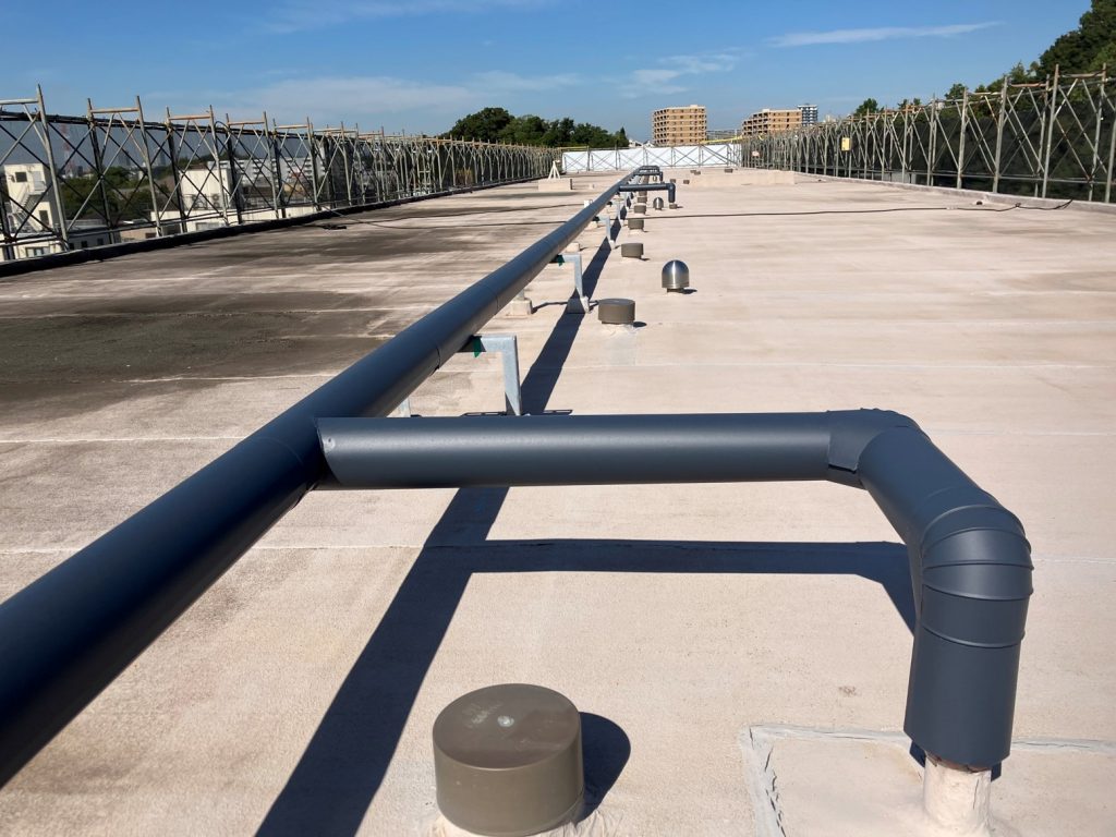 屋上にある水道配管にはさび止め塗装が施され、非常に美しく仕上がっています。この後の色合わせにより、さらに綺麗な仕上がりになる見込みです。