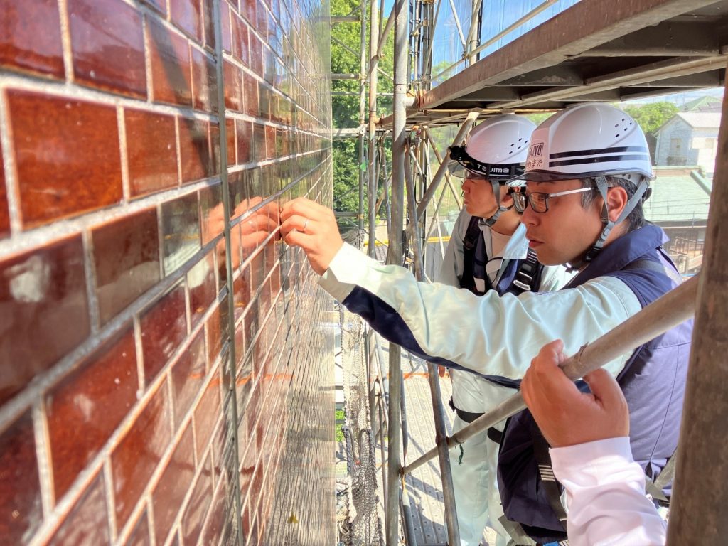 外壁タイル面には全面コーティングが施されており、今回の工事では大幅なリニューアルを行う予定です。その際の施工手順については綿密な打合せを行い、最良な施工方法で進めていました。
