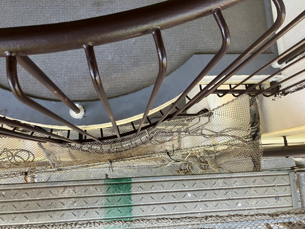 足場内には、上部からの者の落下を防ぐため、外側シートだけでなく内側の躯体側にもネットを張ります。作業員が万が一、モノを落としてしまった場合でも層間ネットがあることにより、下層まで落ちずに済むようにしています。
