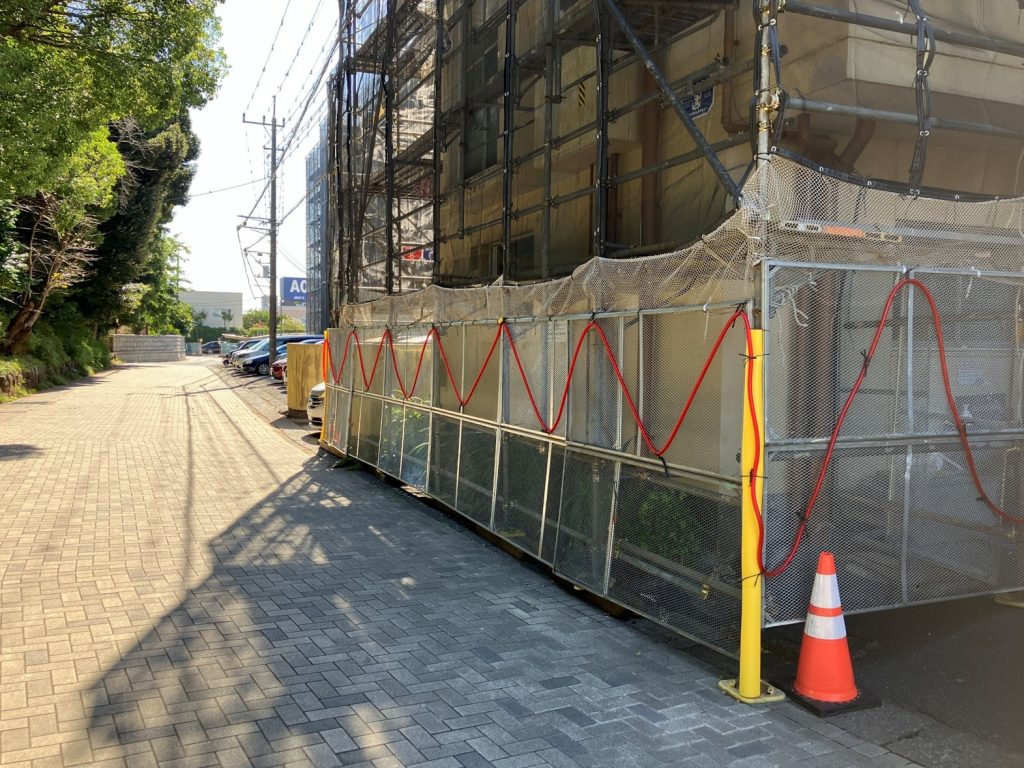 足場が道路面に近い箇所もあります。この道路は通勤・通学に使われているため、万が一の落下事故が起きないよう、一切隙間のない造りとなっていました。