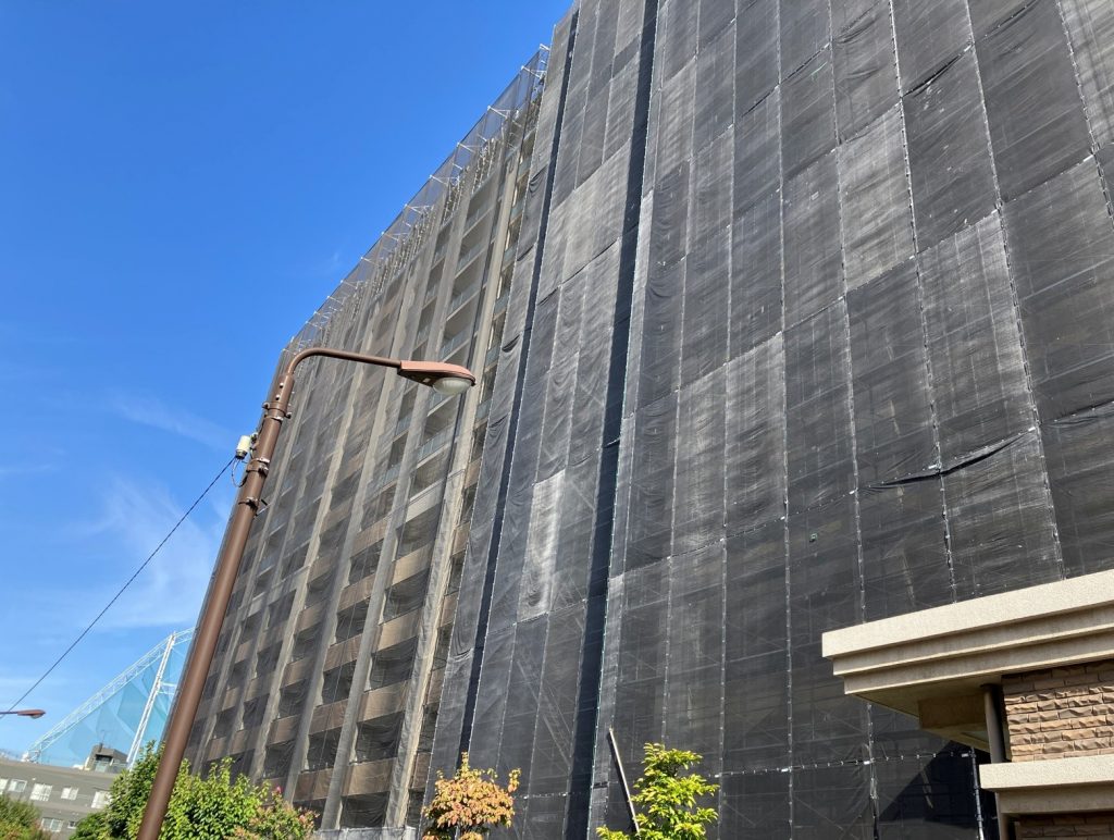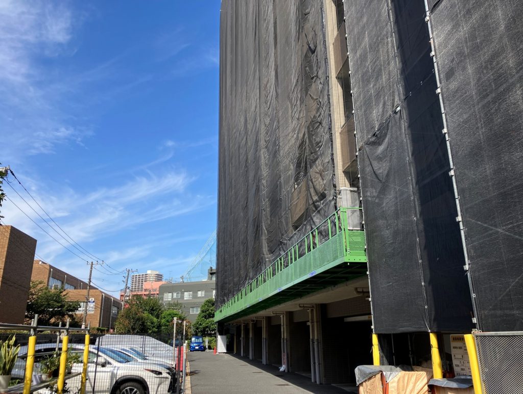 現場は14階建てで現在足場が組み終わり塗装・タイル・洗浄工事などを進めている状況です。