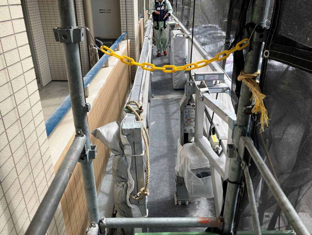 ゴンドラへの乗り入れは足場から行います。ゴンドラが稼働している間は、足場に開口部が生じるため、そこからの墜落を防ぐために手摺を設けなくてはいけません。しかし、パイプなどで手摺を取り付けてしまうと毎回の取り外しが大変になってしまうため、簡易的に着脱可能なチェーン式の手摺を採用していました。