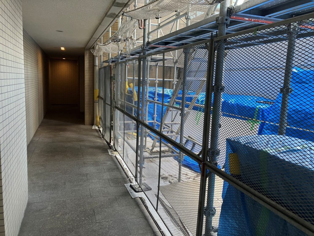 廊下などの共用部近くには足場を設置しているため、居住者様にとって危険となる可能性があります。侵入防止のための枠網を設置し、さらに層間ネットを張ることで落下物による危険を防止していました。
