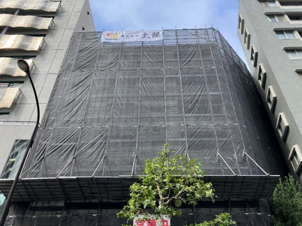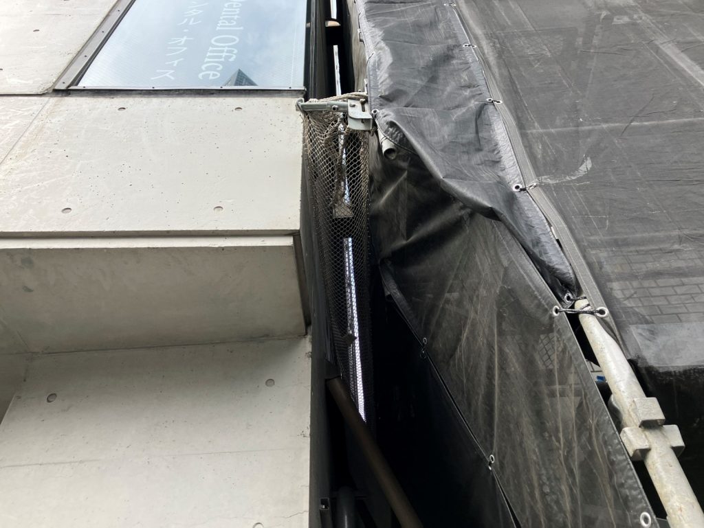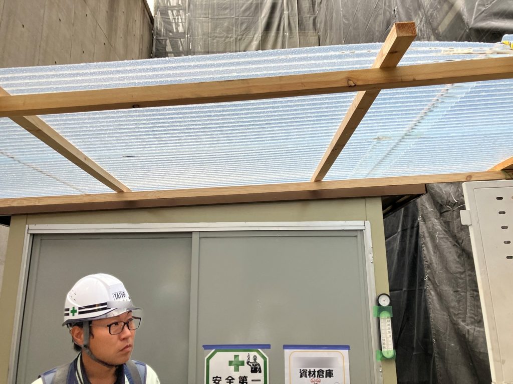 敷地が限られている中で、空いているスペースをどう活かし、作業効率と安全性を確保するか工夫がなされています。倉庫前には屋根を設置し、雨天時でも作業が滞らないように配慮をしていました。また、風対策としての養生も適切に行われており、現場環境の整備がしっかりとなされていました。