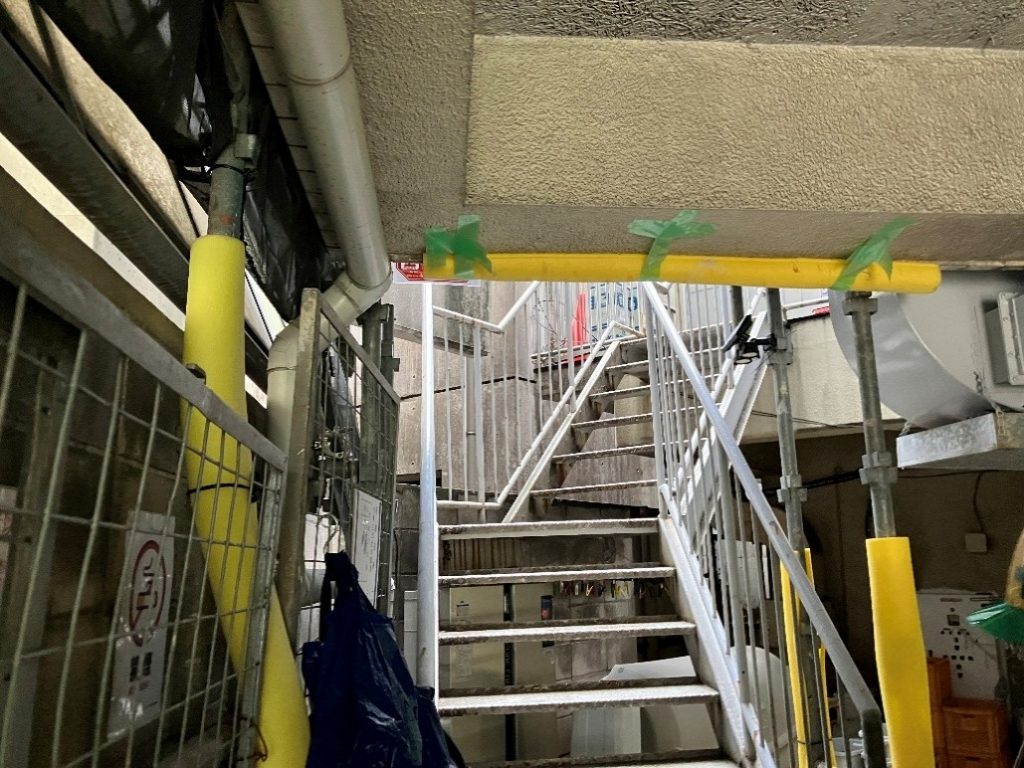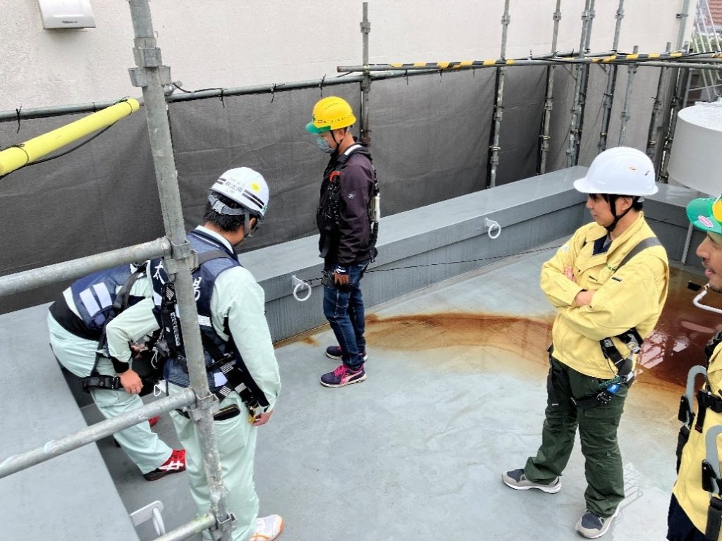 屋上を廻り足場内の点検へ。今回、屋上防水工事は対象外ですが、既存の防水層を損なわないよう十分に配慮した施工が行われていました。
