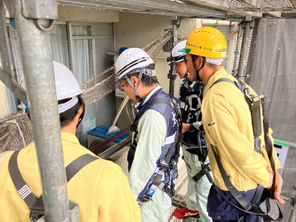 築年数の経過した建物であるため、施工範囲が広く、技術的な工夫が求められる部分も多くあります。特に室外機の移動については、居住者様の生活に配慮した施工手順について、現場で具体的な方法を話し合いながら進めていく予定です。