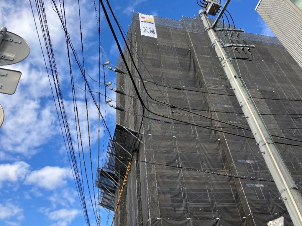 現場は10階建てで、現在足場が組み終わり、下地工事と塗装工事を進めている状況です。