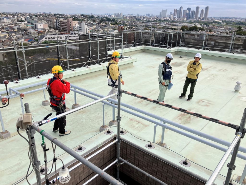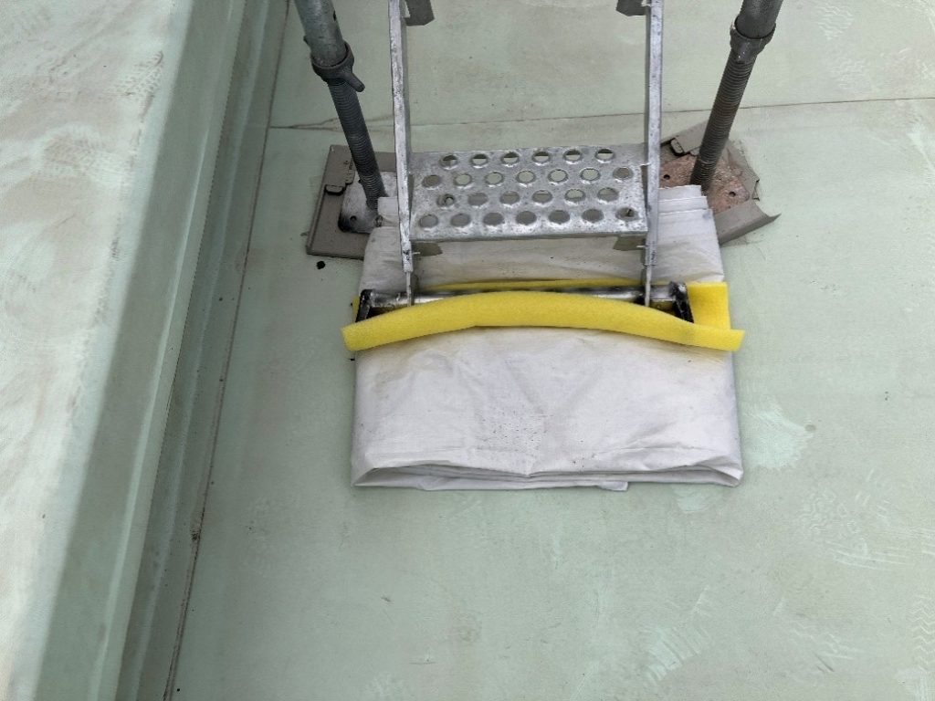 屋上は防水仕上げになっており、鉄などが当たれば傷がついてしまうため、漏水などの原因に繋がります。そのため、しっかりと緩衝材を挟み、養生を行っていました。