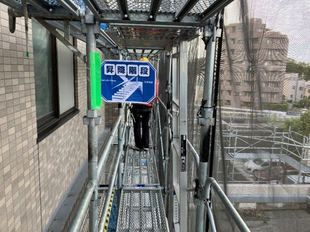 足場と建物を繋ぐ通路として、渡りを設置して通行の利便性を上げます。