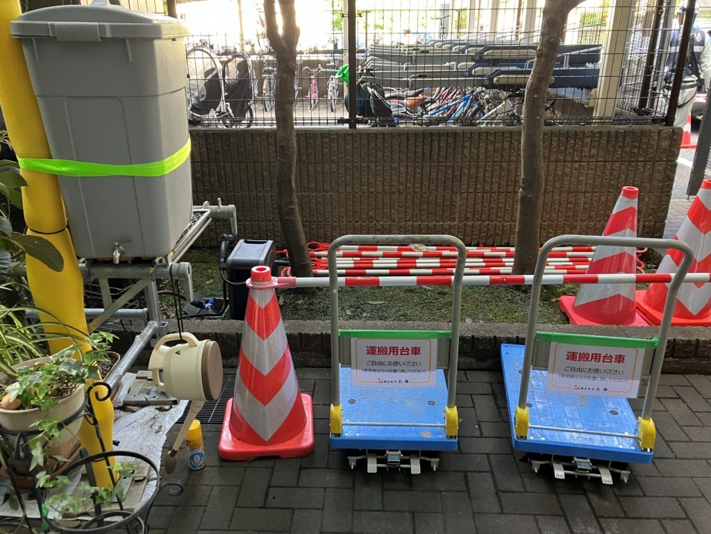 居住者様のバルコニーで作業を行う際、植栽などを移動しなければならないタイミングがあります。そのため、居住者様のために植栽置き場を設置し、大事な物を保管できる場所を提供していました。また、持ちづらいものや重いものもあるため台車を用意し、水やりがしやすいよう、水やり道具の準備も万全に行っていました。