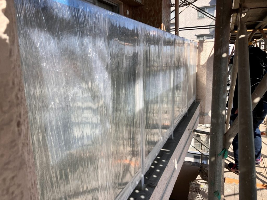 もし破片が居住者の窓ガラスに当たれば、大きな事故につながりかねません。このリスクを防ぐため、当現場では窓ガラス全体をラップで幾重にも巻く養生方法を採用していました。一見シンプルですが、飛散物のエネルギーを吸収し、滑らせることで衝撃を和らげる効果があります。