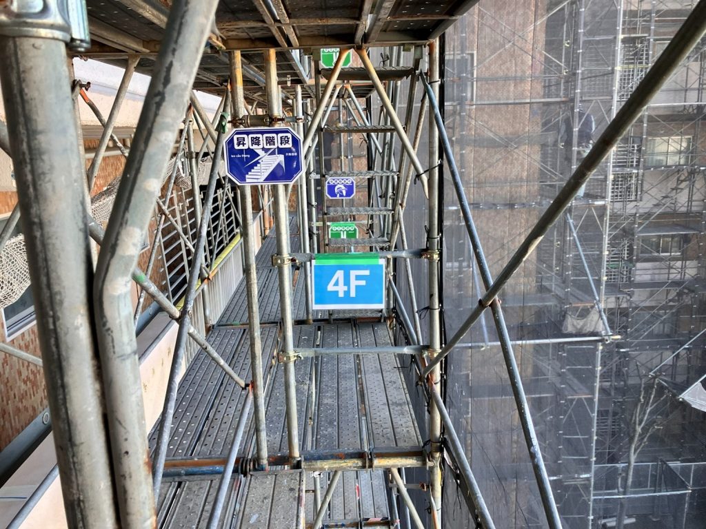 足場内には階数表示や昇降階段の案内など、遠くからでも一目でわかる看板が各所に掲示されていました。命を守る「親綱」と、迷いをなくす「視覚情報」の整理。