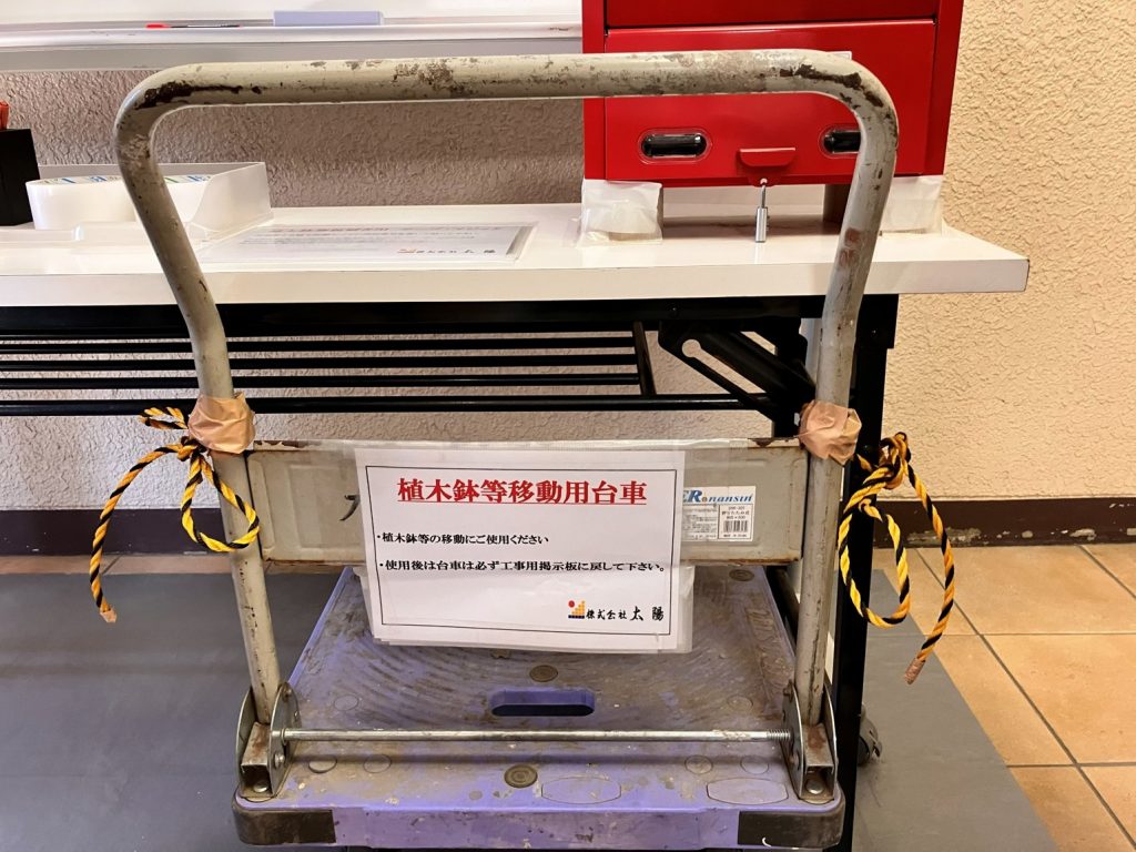 経験豊富な当現場代理人は、当マンションの居住層に高齢者が多いことをいち早く察知し、先回りした対策を講じていました。それが、エントランス付近に用意された「鉢植え等移動用台車」です。重い鉢植えを運ぶ負担を代わりに取り除くことで、居住者様の些細な困りごとを解消。