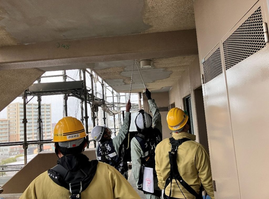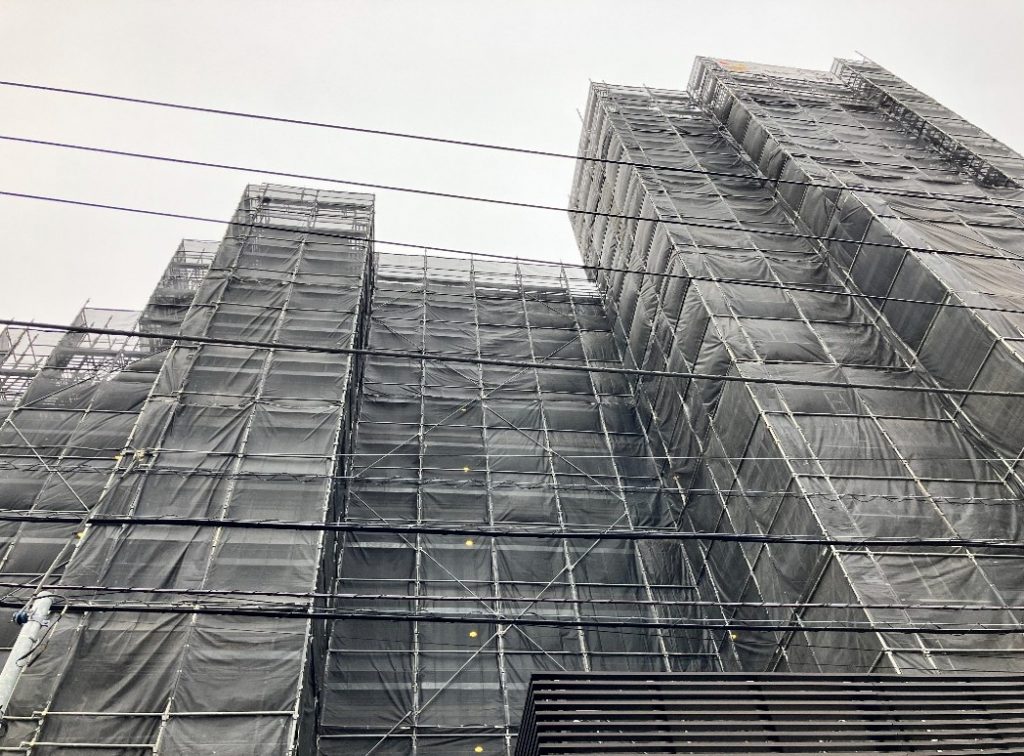 当マンションは線路沿いに位置するため、足場の組立作業では非常に気を遣う工程となりました。まだ工事は前半ですが、居住者様とのコミュニケーションや作業員の皆さんとの連携がしっかりと取れており、現場は和やかな雰囲気が感じられました。これからも「居住者ファースト」の意識を大切にし、無事故・無災害で取り組んでまいりますので、引き続きよろしくお願いいたします。