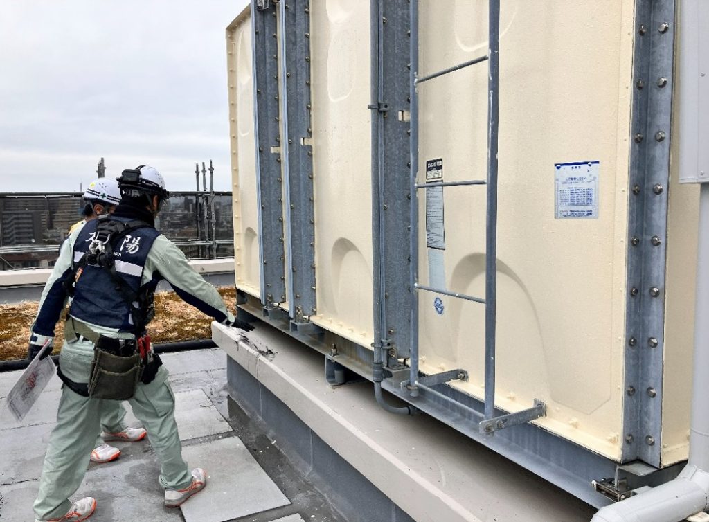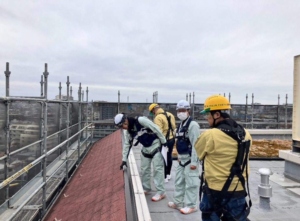 屋上は防水層となっており、そこには植生が整えられていました。居住者様のこだわりが感じられるつくりです。このような部分は施工が難しく、熟練した職人さんの知恵と経験が大きく活かされる箇所でもあります。本日参加したメンバーからアドバイスをいただき、再度手順の確認を行うことができました。