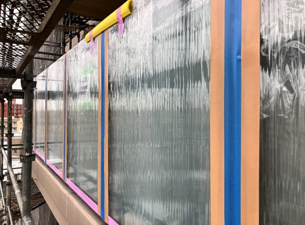 改修工事では、タイルの斫り工事などにより破片が飛散したり、使用中の工具を万が一落下させてしまうなどの危険が潜んでいます。そのような万が一に備え、ガラス面にはラップによる養生を施し、安心・安全の確保が徹底されていました。