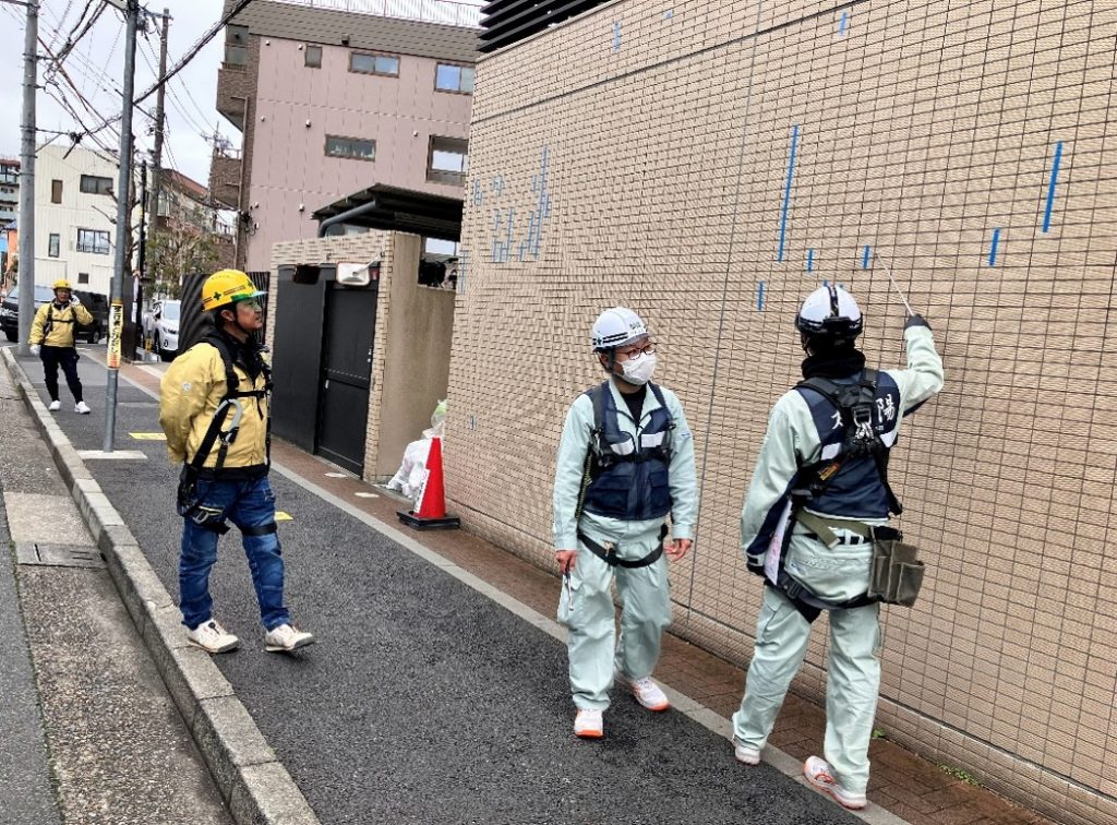 本日は東京都江戸川区にあるマンションの安全パトロールへ行きました。現場は12階建てで現在足場が組み終わりと下地・シール・塗装工事を進めている状況です。
